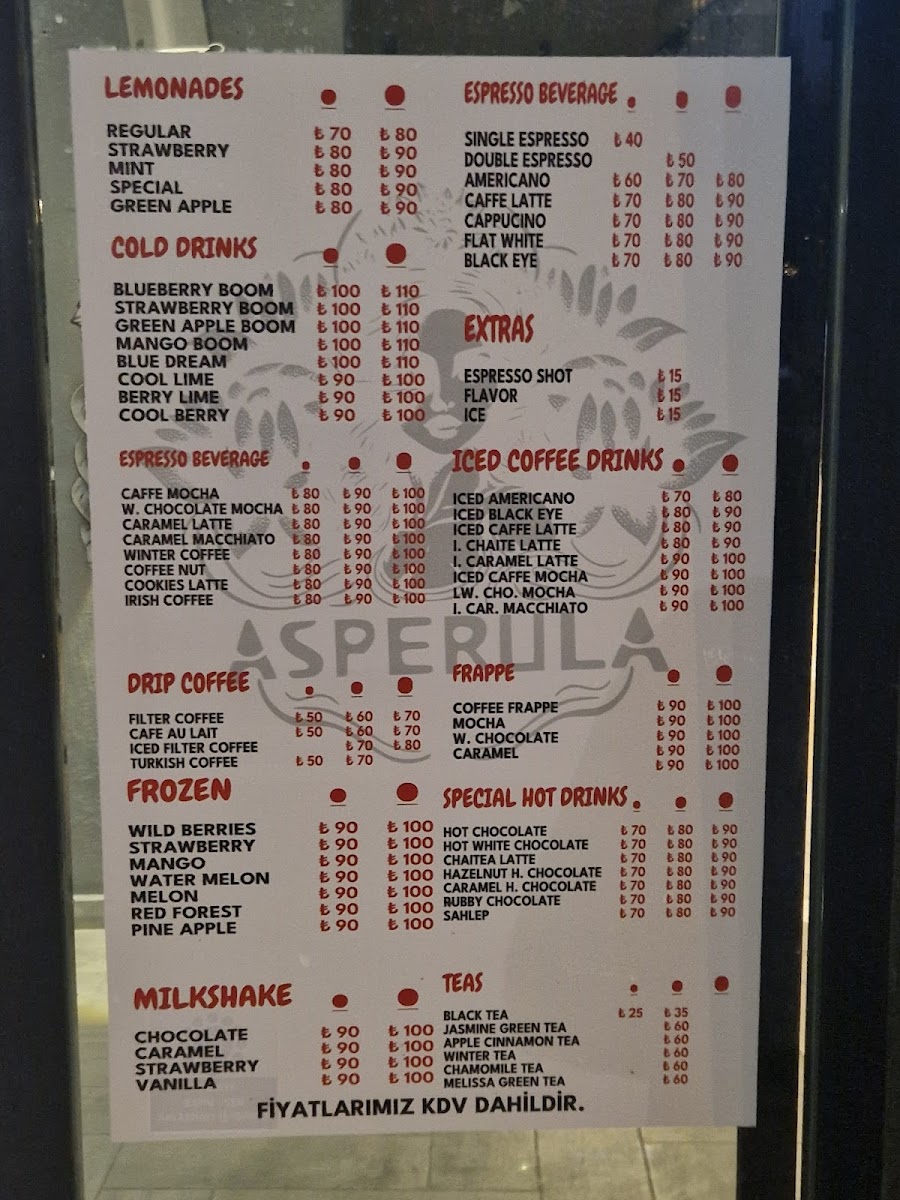 Welcome to Asperula, a charming café nestled in the heart of Kırşehir, Türkiye. Located at Medrese, Cacabey Cd. no:1/3, this delightful spot is perfect for anyone seeking a cozy environment to unwind. The menu offers a diverse selection of premium coffees and refreshing cold beverages, ensuring that every sip is a moment of pleasure. Customers rave about the exceptional quality and taste of the drinks, making it a go-to place for coffee enthusiasts.
